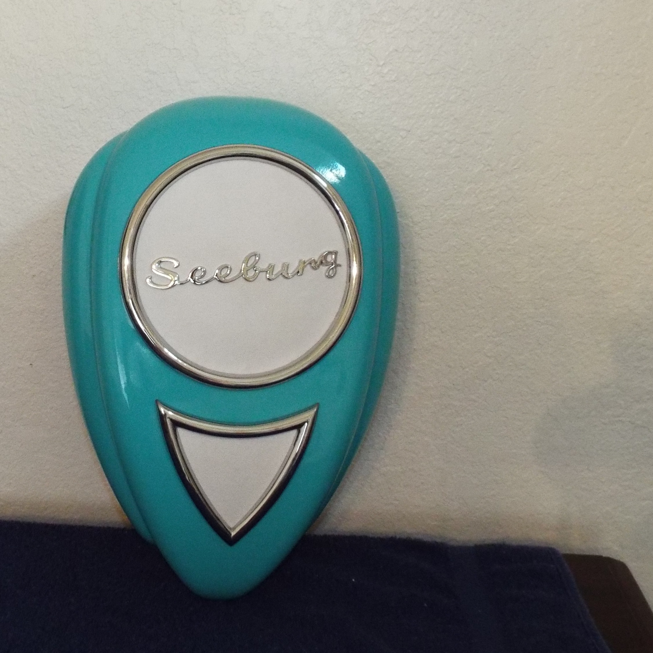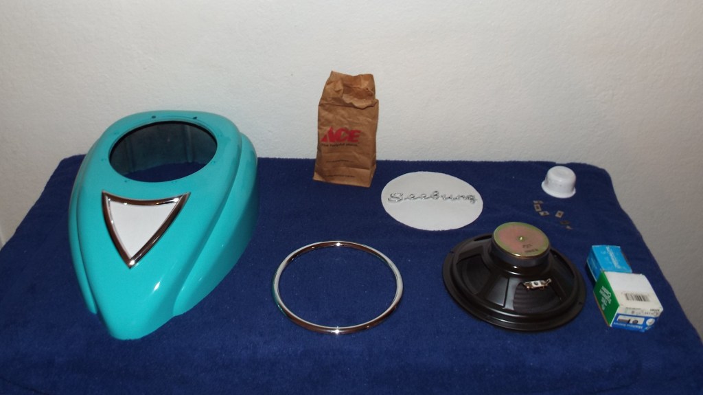 I took time today to get back on a project I had started some time ago and laid aside for whatever reason. It is a RS1-8 tear drop speaker made from 1946 to 1948. I had painted this one a beautiful green blue high gloss called St. Tropez by Rustoleum. This is the best paint job I’ve ever done from a rattlecan. The finish is flawless and I love the color. It took me a long time to pick out a speaker cloth. I finally opted to use white. I went to Joanne’s Fabric Shop here in Mesquite and looked at every white cloth they had finally picking a yard of one. It turned out to be a good choice. It meshes well with the speaker color and allows the chrome to stand out. Speaking of which, the Seeburg logo was ordered from a chap in England. I was a bit hesitant but when I got better pictures of it I took a chance. And dang glad I did! This logo is so good it could actually pass for NOS. It might be NOS come to think of it. He apparently only had a few. The guy did me right as well. I ordered two and he sent three.