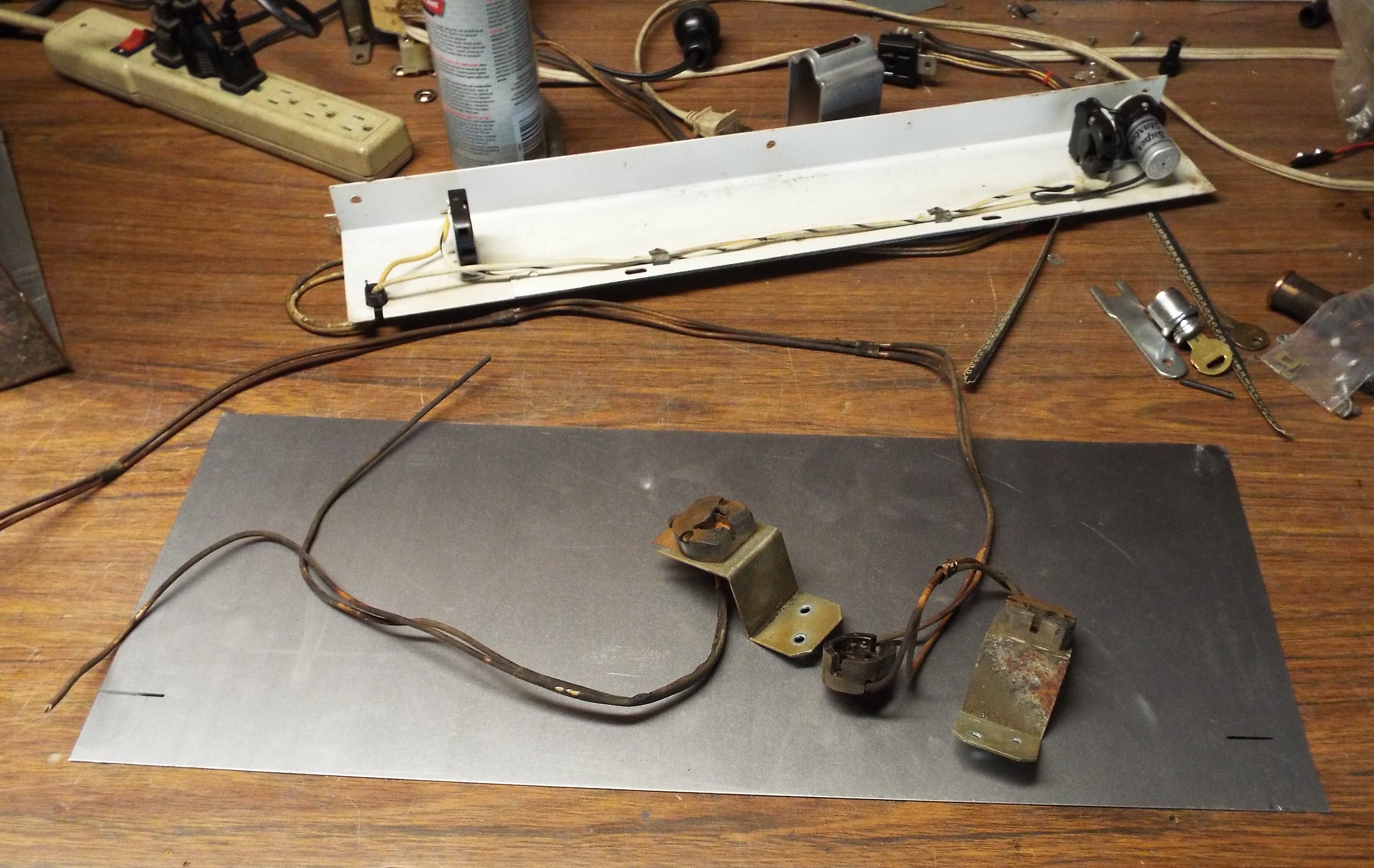 I started work on a fun project. A previous owner had replaced the bottom glass on the SMC2 with a mirror. Fine and good. Those glasses were prone to having all the pretty stuff flake off. Here’s where it gets a little strange. There is a lamp holder underneath that glass. It holds a starter and a 14″ lamp. It was removed and the wires pulled out of the harness loom as well as out of the molex plug. Why they didn’t just take the lamp out and leave everything in place is a mystery. So I get to make a lamp holder. I already have a replacement glass courtesy of Victory Glass and $165. This should be a pretty straightforward process.