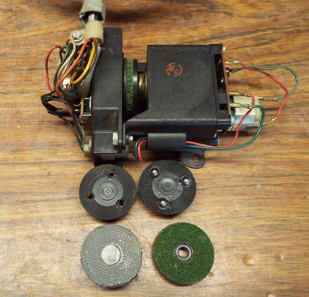 Now for the other half-the motor side. They are coupled one of two ways. One is with steel balls in holes, the other is with a Velcro-type arrangement. Both allow slippage. Not really Velcro or is wouldn’t slip when either end of rotation is reached. I used the 3 ball arrangement with this one like it had on the prior volume control cable. Just a matter of swapping it over to the new cable, eh? Nooo….the motor wouldn’t rotate the volume pots. Just slipped. I pulled the volume side piece up some. It was too close to the housing. When I loosened the two screws holding the halves together the motor would turn the pots. I finally took the spring out from the motor side and cut one loop out of it. This eased the pressure against its other half and allowed the pots to rotate. Only took two hours in 95 degree heat to get this all taken care of.