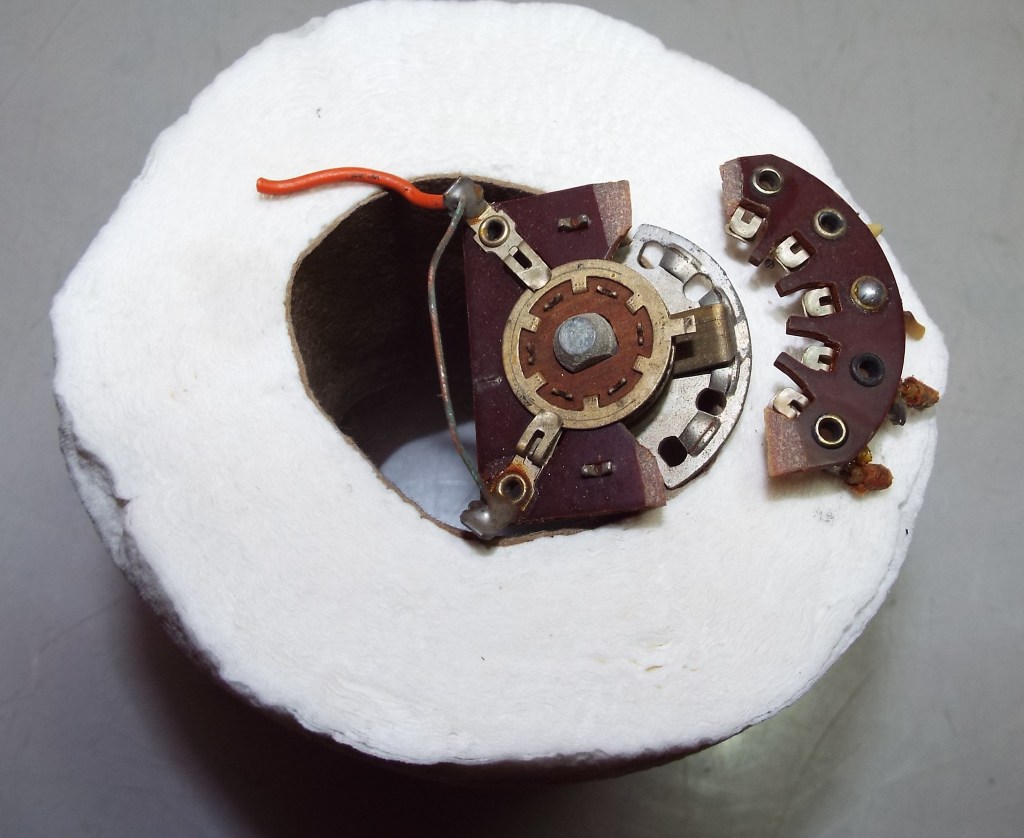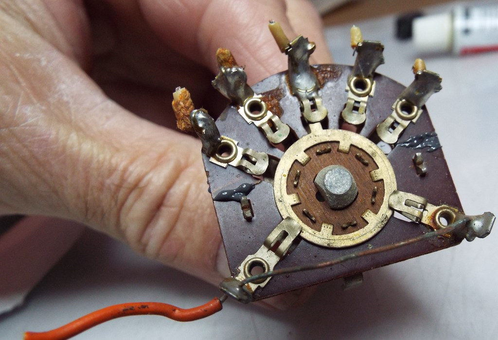 One more application of JB Weld this time for support. I slather it on top and bottom over the spot where it cracked and let it dry overnight. This switch was clean. Had it been dirty I would have sprayed the bakelite with contact cleaner before using the epoxy to give it the best chance at holding. As it was I used the trusty Dremel with a small wire brush and polished the two brass rings now covered with epoxy for the same reason. One only has to be careful not to get epoxy on any of the moving parts. After this has cured the switch is ready to remount in the amp, carefully desolder what’s left of the wires on the tabs and re-solder the transformer leads back on.