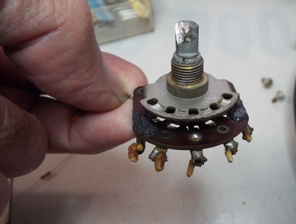 The half of the switch with five wires on it is basically floating in space so I just cut the wires going to the it one at a time and tag them as they are removed as to location. I will also make drawings; anything to help get the wires back where they belong. Of course the schematic shows clearly what goes where but with the old cloth covered wires it isn’t very easy determining wire color most of the time. Once that is done I remove the knob, unbolt the switch, and remove it. You will note in the last pictures that the stem got chewed up a bit. The knobs are held in with slotted screws in the early amps and hex head screws in the later ones. This one has a hex head and it was rusted just enough that the hex wrench I used just turned without purchase. I ended up using a Dremel tool with the cut off wheel to get the @3#* knob off. I almost went too far as part of the shaft got chewed up. Note also where the witness mark is for the hex screw. A new screw will still tighten up and securely hold the knob. I got lucky.
