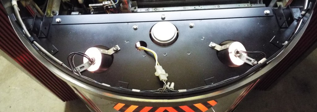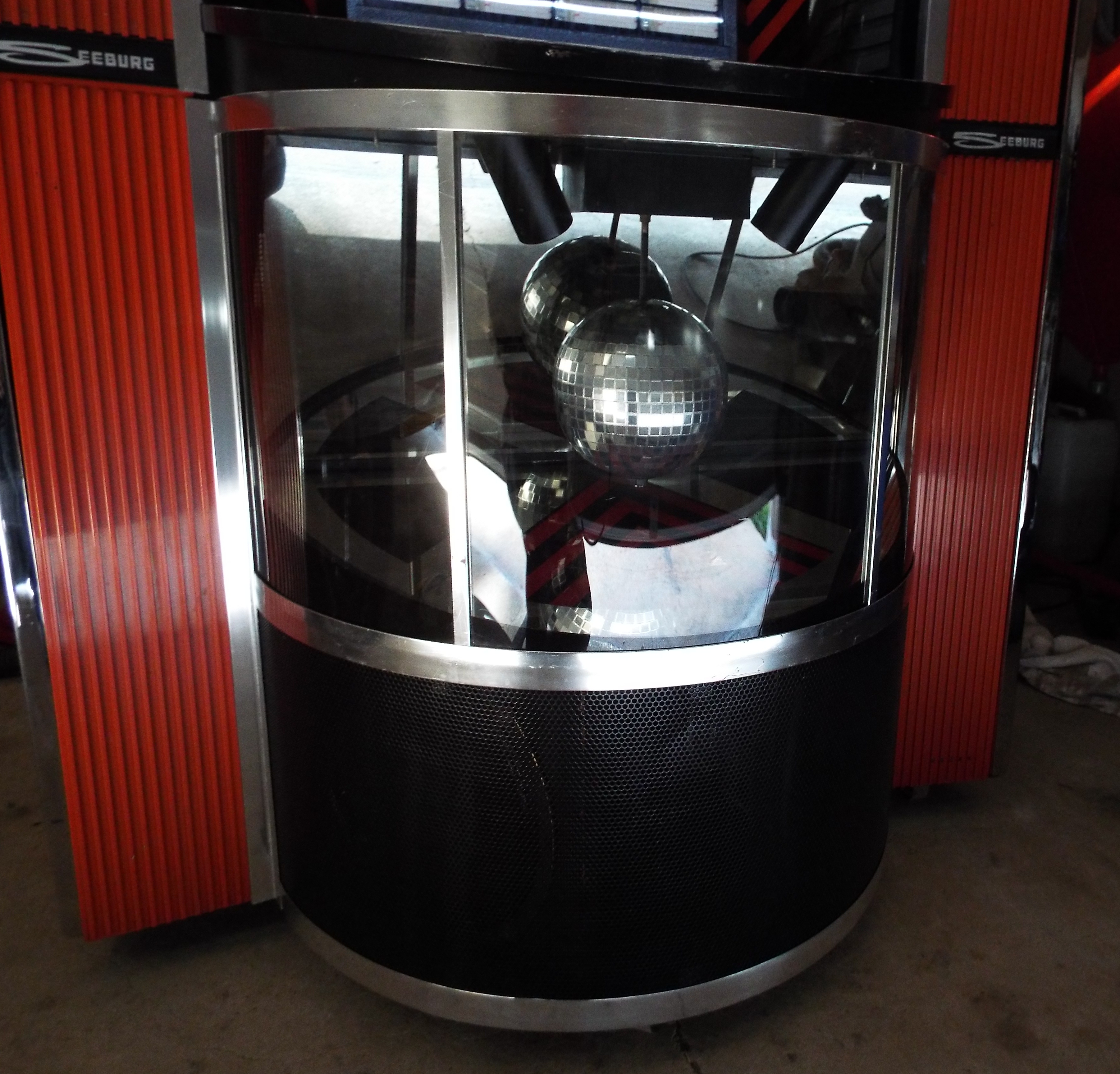I started by re-attaching the lower screen. It had been rusty with faded paint but none of the screening was bent so once painted it looked like new again. The now fabulous trim goes below it. With all the assembly screws being the same size and with “witness marks” showing where they went it is an exercise in patience just needing to get things lines up and re-attached. Next was the newly painted upper piece that the spot lights mount to. After this was the plastic circular tub that the lamp holder assembly mounts to. Then the new reproduction lower glass from Victory Glass. It is gorgeous. It is an exact reproduction, so well done it could pass for new old stock. What I like to do with jukebox restorations is make them “shiny new” looking like it just rolled out the factory door. What with all the repainting, polishing, and new glass I was able to achieve this. The rear glass went on; then the ball and spotlights up top with its wiring. Now the lower door was back in one piece. I stood it upright next to the jukebox and wired the lights into a new plug and then plugged it into its jukebox mounted mate and turned the jukebox on. Lights and a spinning ball!
