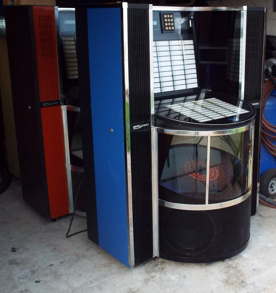 The cosmetics for the SMC1 have been finsished and the juke is done. Hah! That sentence only covers about five hours of work to the lower front door. I prop those up on the bench and then remove the glass, the lower screen and trim pieces. Everything gets cleaned. I’ll even take nasty screws and clean ’em up on the bench grinder wire wheel. The black anodized pieces get wiped down. Glass is cleaned and even this is more involved than it sounds. Seeburg used some kind of sticky foam tape around the edges of any glass. Just a pain in the butt to remove and clean up. Glass will usually have something on it after all the years that involves a razor blade and/or polishing compound to remove. The most labor intensive part is getting as much of the old paint off the bottom screen as possible. I use a 3/8″ drill and a wire wheel and this helps but is still a tedious chore. Can’t be glamor all the time. Grills get painted semi-flat black.